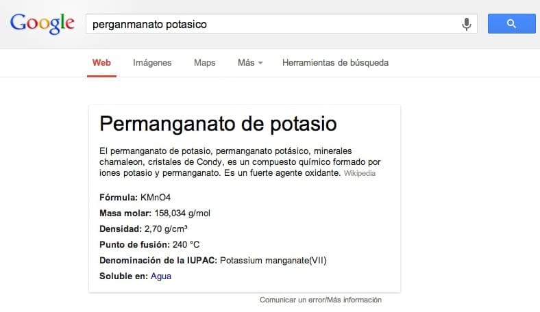 Google, trabaja con cualquier tipo de compuesto, pero si tenemos algo que reclamar es que no es capaz de resolver ecuaciones químicas, una tarea pendiente que me gustaría ver en el buscador.