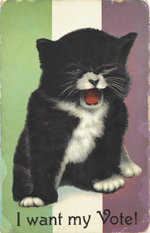 Esta tarjeta postal de 1908 representa a las sufragistas como un gato de aspecto vicioso que grita "quiero mi voto", como si fuera equiparable que un animalito quisiera participar en las decisiones del Estado.