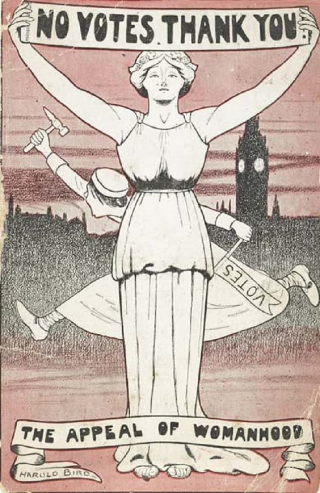 Esta postal, titulada "El llamado a la feminidad", fue diseñada irónicamente por un hombre, por Harold Bird, para anunciar una reunión contra el sufragio en el Royal Albert Hall organizada por la Liga Nacional por el Sufragio Femenino Opositorio.