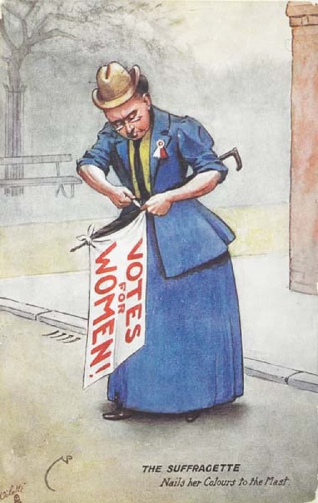 Esta representación de las sufragistas se usaba comúnmente en 1908. Una de las anécdotas de aquél entonces fue la vez que un hombre que observaba las protestas a favor del voto femenino alzó la voz diciendo que si las sufragistas estuvieran "más presentables" tendrían más probabilidades de ganar el voto.
