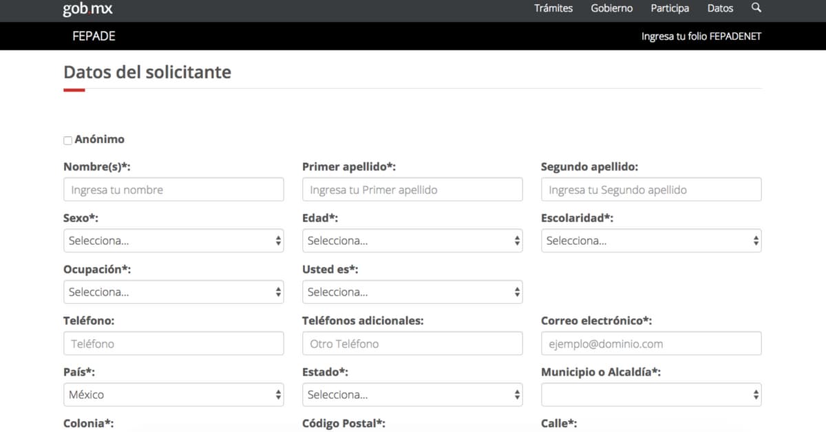 Si la denuncia es por medio del sitio de la FEPADE, será necesario que llenes un formulario con tus datos (nombre completo, sexo, edad, escolaridad, ocupación, teléfono, correo electrónico, país, estado, municipio o alcaldía y dirección completa). También es indispensable proporcionar información sobre los hechos: la fecha actual, fecha y hora en que ocurrió el presunto delito electoral, así como la ubicación exacta (país, estado, municipio o alcaldía, colonia, código postal, calle, número exterior y referencias).