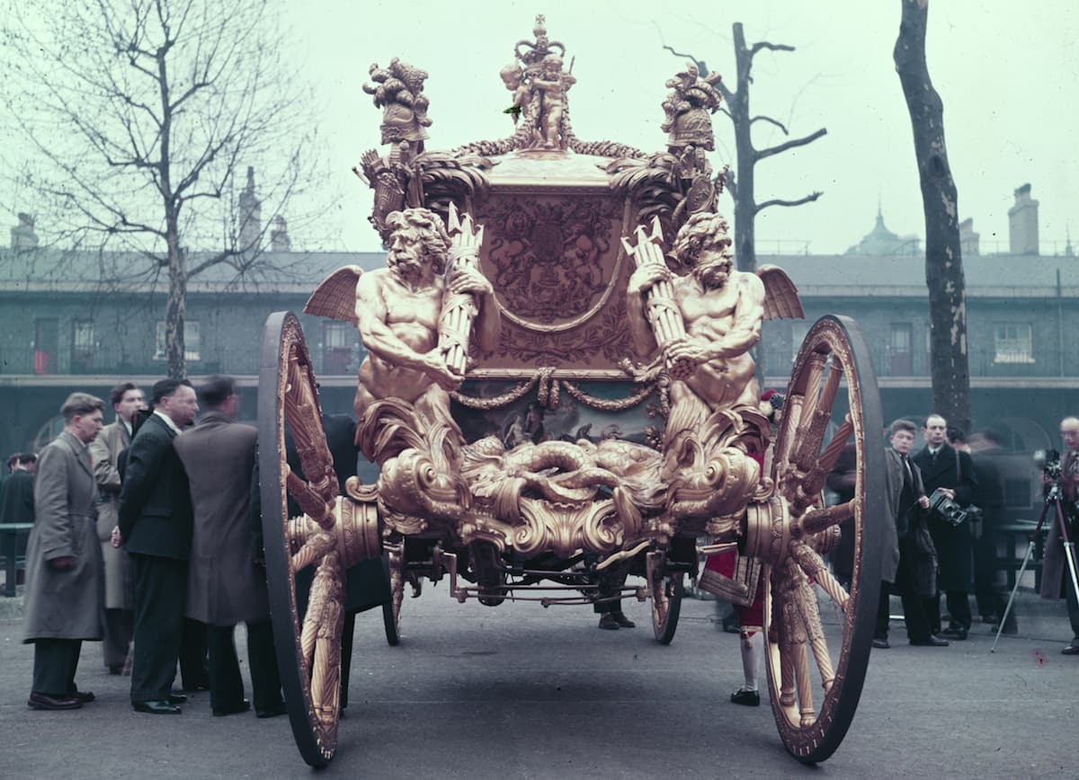 La reina Isabel utilizó el carruaje llamado ‘el entrenador de Gold State’ para realizar el recorrido y saludar al pueblo británico. Este carruaje fue construido por Samuel Butler en 1762. Los tritones de las esquinas representan el poder imperial de Gran Bretaña.