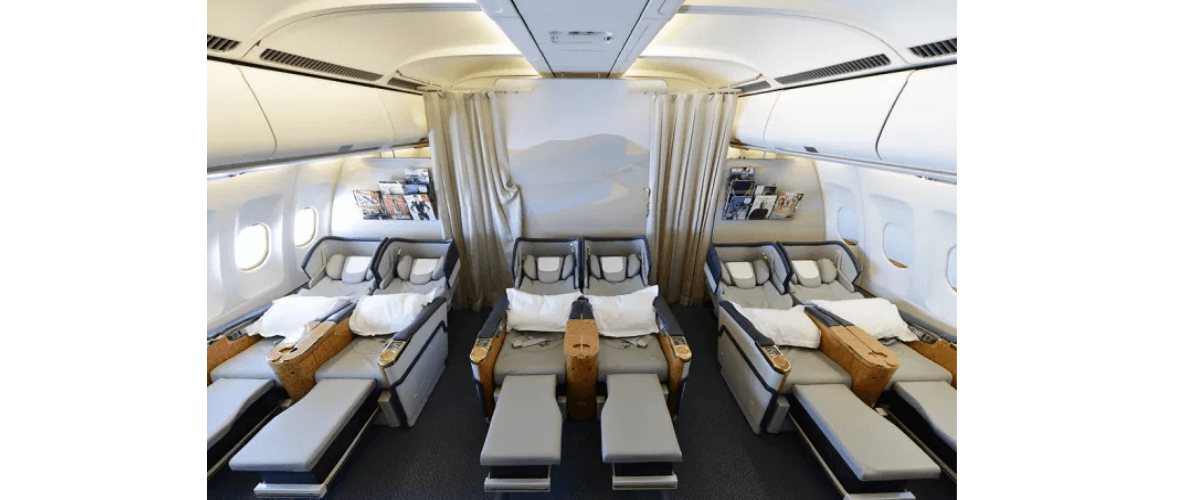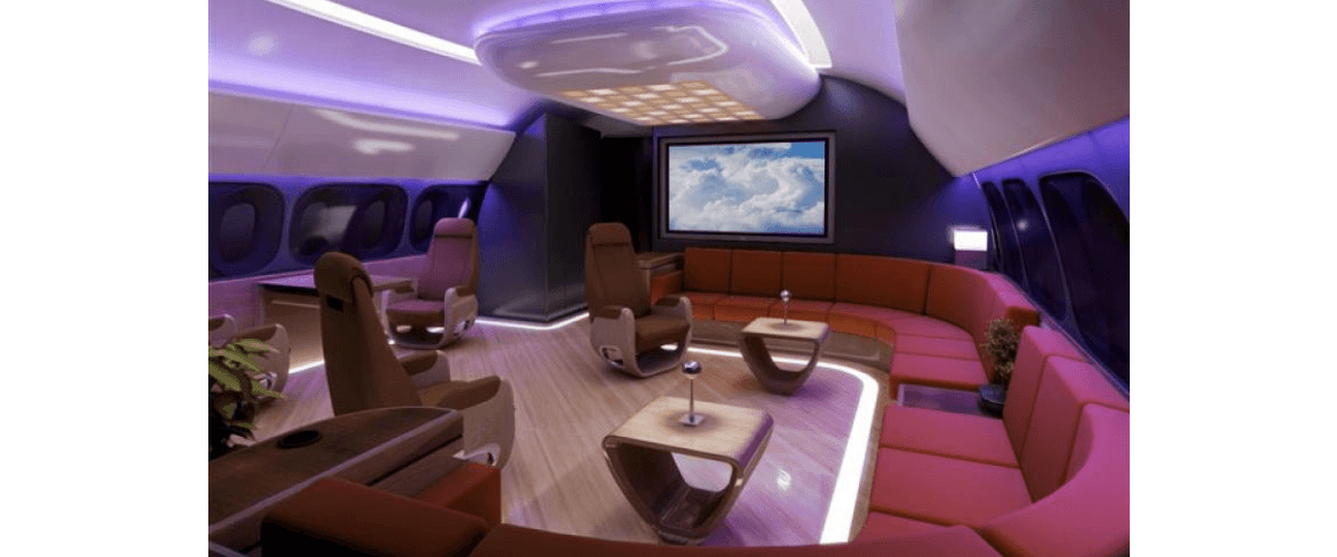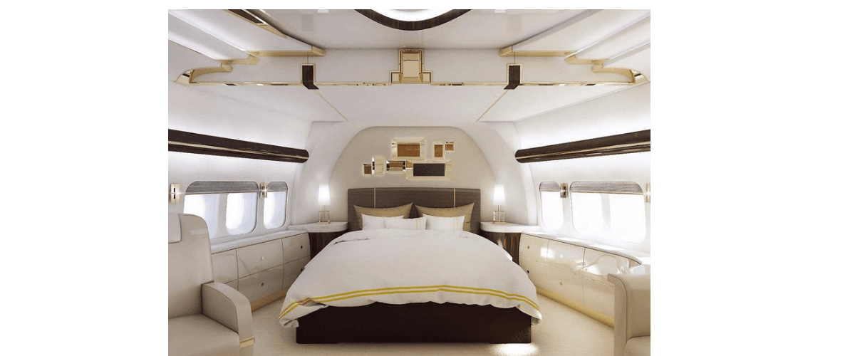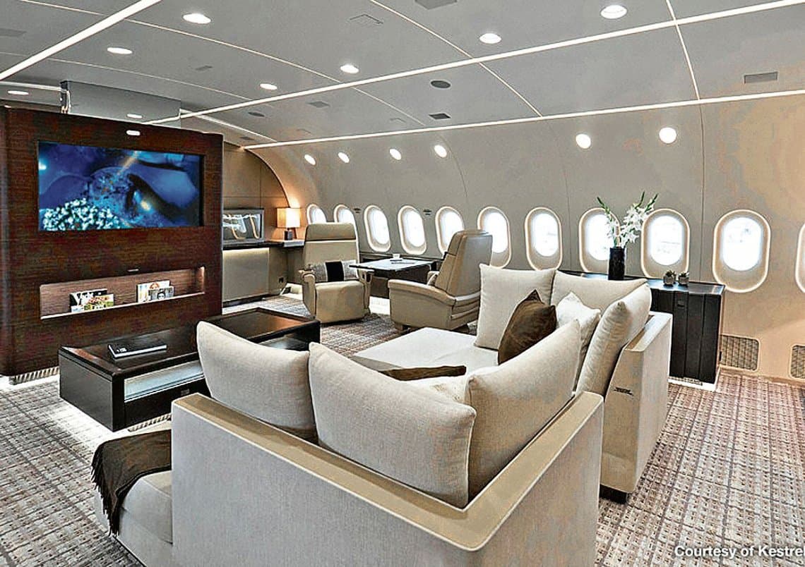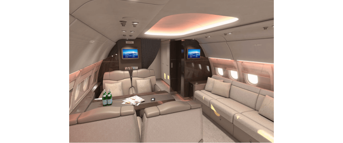 Los asientos son afelpados y tiene literas para la tripulación. Además ofrece una suite con ducha e Internet disponible, incluso a 10 mil metros de altura.