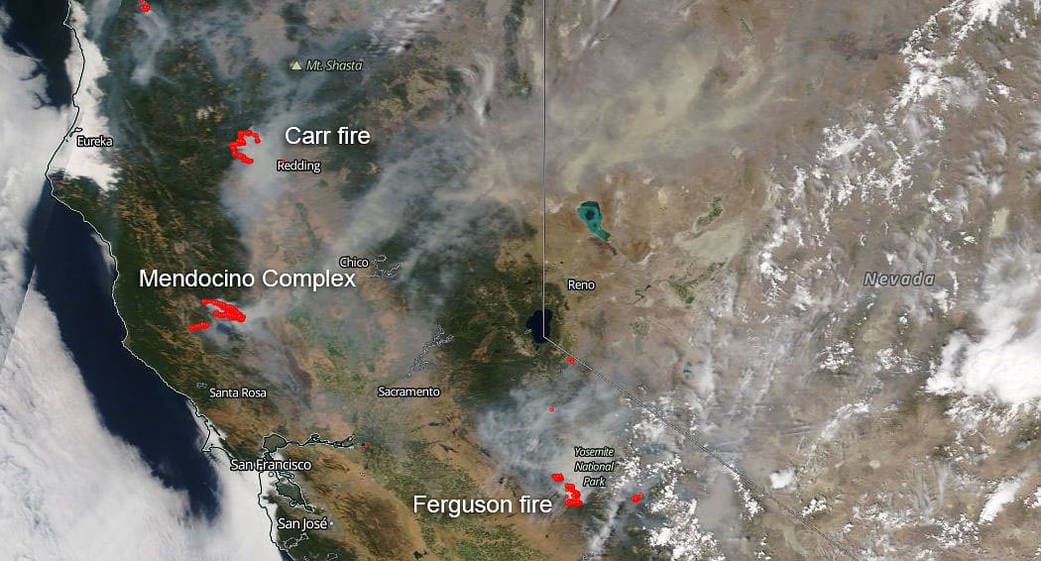 El satélite Aqua de la NASA captura la cortina de humo de Mendocino Complex