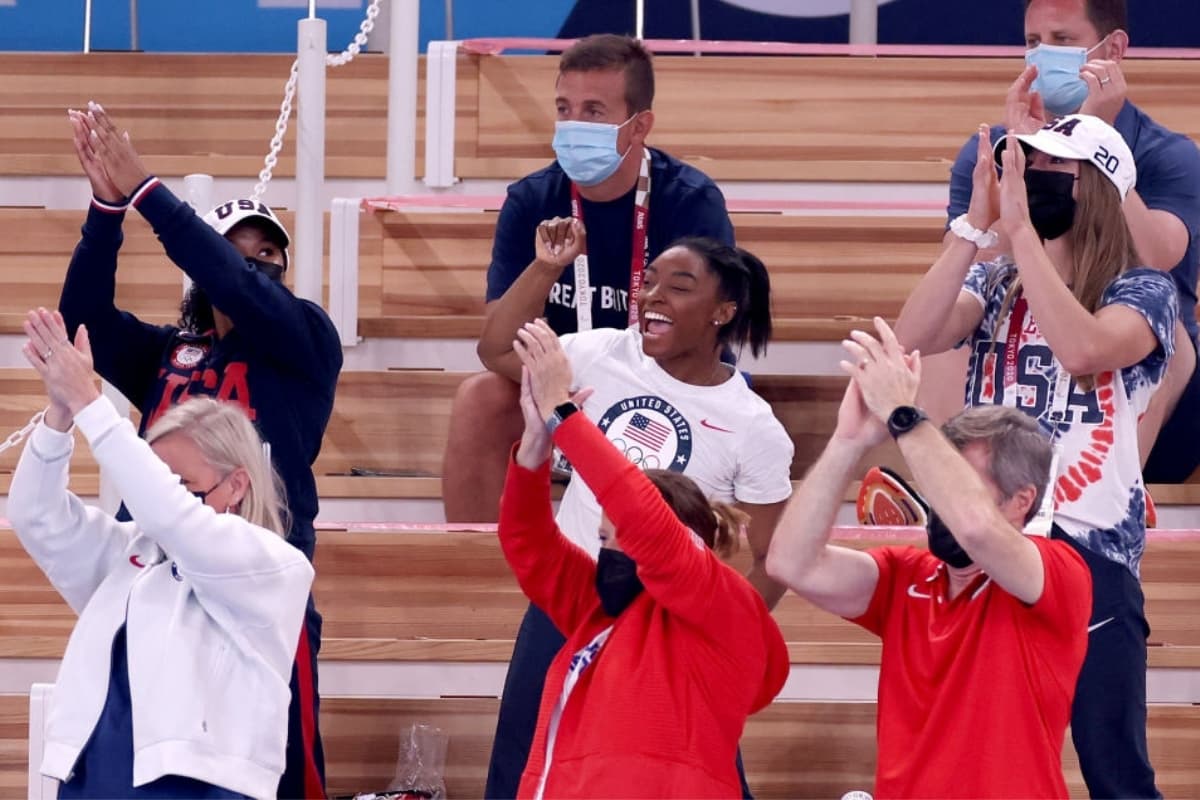 Lejos de dejar que sus problemas la opacaran, desde las gradas aplaudió a cada una de sus compañeras del equipo de Estados Unidos y a las gimnastas de otros países. Incluso, les aplaudió y gritó algunos de sus nombres para echarles porras.