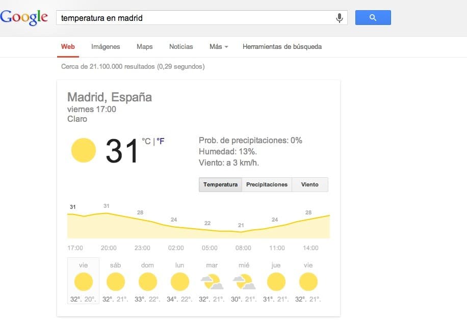 En los resultados no sólo verás la temperatura actual, sino que también un pronóstico extendido para la semana y, temperaturas especificas para las diferentes horas del día. Si lo deseas, con sólo un clic puedes averiguar datos sobre lluvia y viento.
