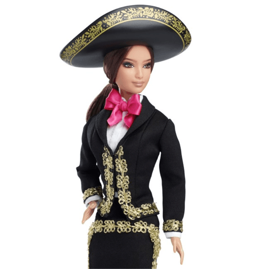 No cabe duda que la influencia latina está más presente que nunca, y la muñeca más famosa de todos los tiempos retoma uno de los símbolos icónicos de la cultura mexicana. Barbie ahora con un look de piel morena, ojos y pelo castaño y mirada profunda, llega a las jugueterías y aparadores de USA y México vistiendo el tradicional traje de charro con bolero negro y pantalones con detalles en dorado, botas y el inconfundible sombrero.