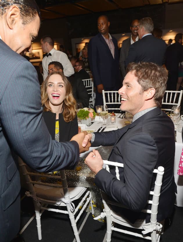 Emily Blunt y James Marsden saludan al ex beisbolista y miami local Sammy Sosa