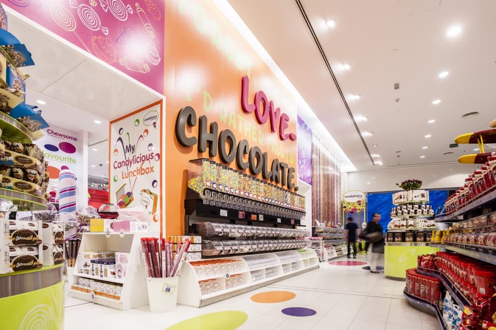 Candylicious cuenta con la pared más grande de dulces; está llena de ositos de goma, gusanitos y caramelos (todas excelentes opciones que nos harán realmente difícil la decisión de qué llevar). Además, en el centro de la tienda, podremos encontrar un enorme árbol de chocolate, lleno de paletas de colores.