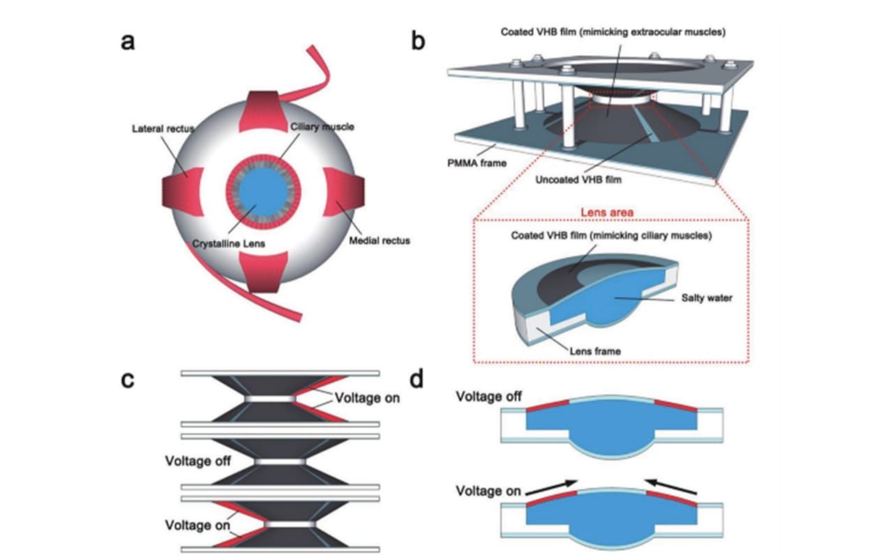 De acuerdo con sus afirmaciones, el material principal para la fabricación de estos lentes es el elastómero dieléctico, el cual ayuda a que el lente cambie su forma y pueda conseguir los cambios de foco necesarios, lo que aumentaría el campo visual hasta en un 32%.