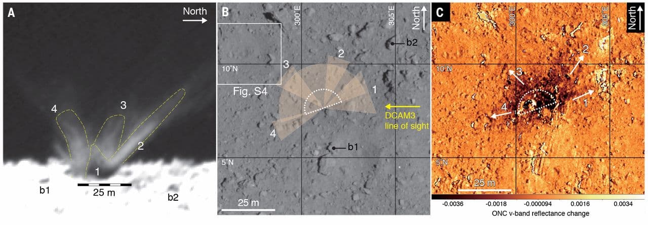 El objetivo de hacer un cráter en el cuerpo celeste era estudiar la composición de materiales desprendidos del asteoride. La imágenes enviadas por la nave espacial revelaron una distribución de rocas oscuras y otras brillantes.