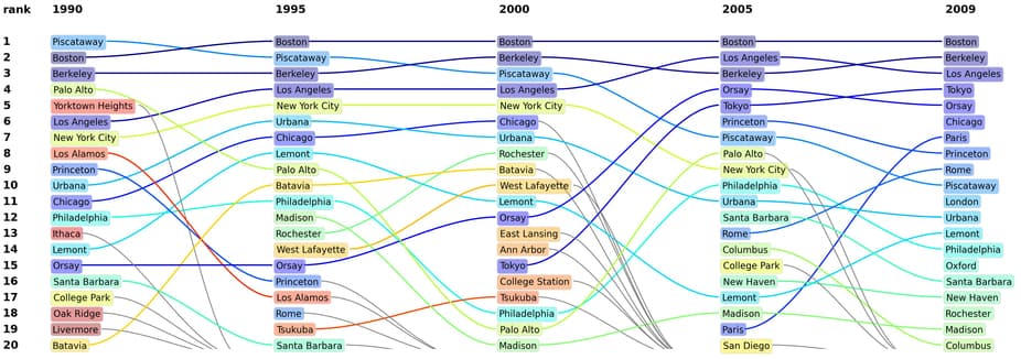Esta imagen muestra el ranking de las mayores «ciudades científicas» para los años 1990, 1995, 2000, 2005 y 2009. Las líneas de colores muestran los cambios de cada ciudad en su posición en el ranking. Las líneas grises muestran las ciudades que desaparecen del top 20.
