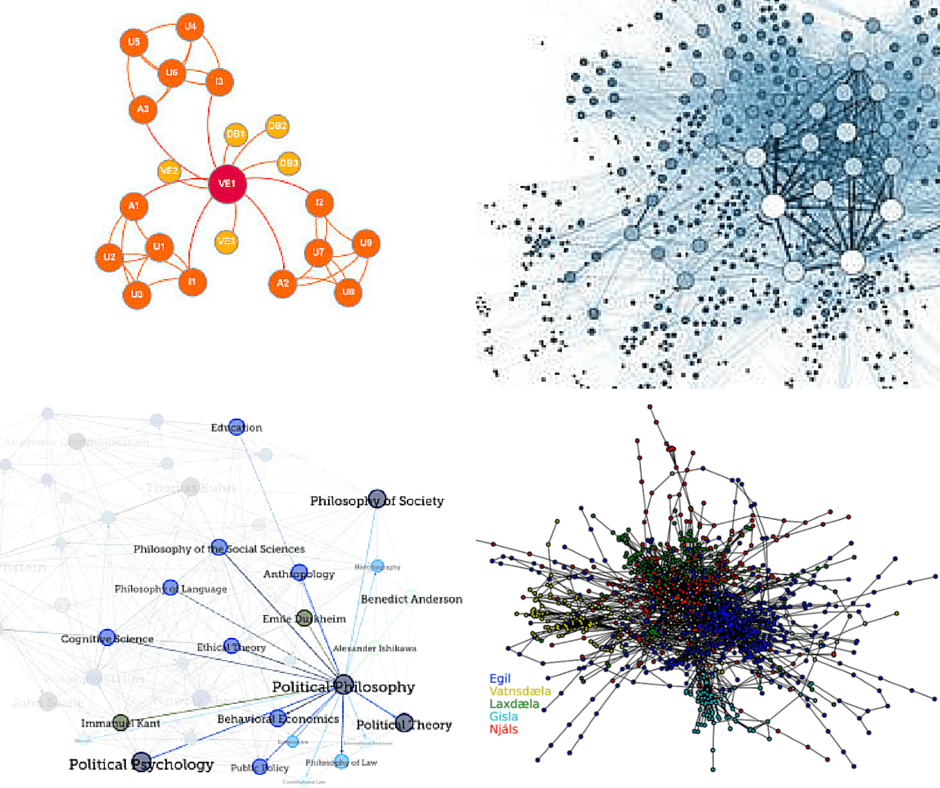Gracias a la colaboración de la American Physical Society lo investigadores pudieron recolectar los datos de interés, y gracias a diferentes software de georeferenciación, pudieron realizar un mapa de «ciudades científicas». Para analizar la información los investigadores se basaron en la teoría de redes, o Network Theory, que identifica actores como nodos, y sus relaciones como las líneas que los conectan. En la imagen de más arriba vemos algunos ejemplos de la aplicación de esta teoría.