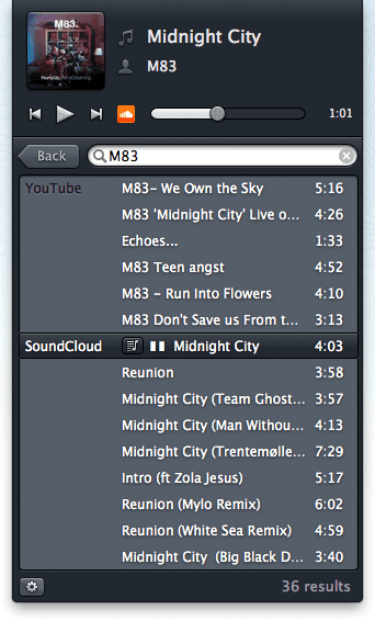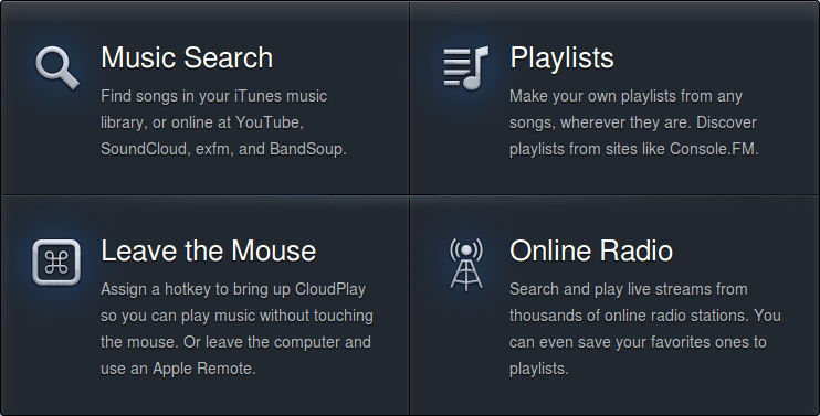 CloudPlay está basado en una idea muy simple: Reproducir la música que se encuentra en tu Mac pero también la música de sitios como YouTube, SoundCloud, BandSoup y exFM todo desde el mismo lugar. Un concepto que tal vez no sea revolucionario pero que puede ser de gran ayuda para aquellos que ya no almacenan música en su disco duro.