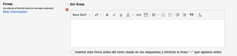 Una vez allí verás que cuenta con un campo de texto donde podrás insertar, con ciertas herramientas como tamaño, fuente y color, el texto que quieres que aparezca como tu firma personalizada de Gmail.