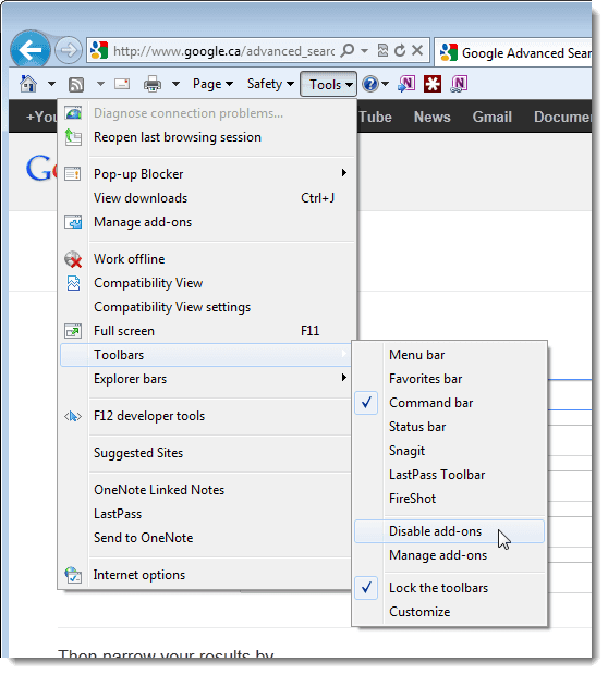 Una vez que se despliega la nueva barra debemos ir a " Tools" (o Herramientas) y luego bajar hasta la sección de " Toolbars" y seleccionar la opción " Disable Add-Ons".