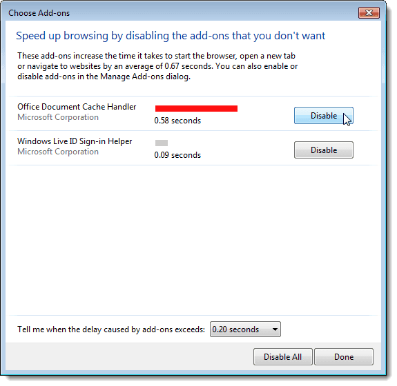 Hecho esto se abre una nueva ventana donde encontraremos los Add-Ons que tenemos instalados y una barra que nos indica cuanto tiempo nos hacen perder en la navegación. Simplemente haciendo click en " Disable" deshabilitaremos la extensión y nuestro Internet Explorer comenzará a navegar más rápido.