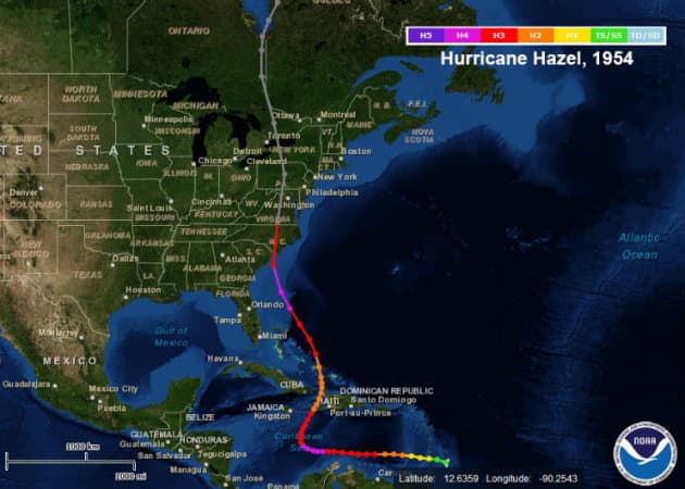 Hace 62 años, Hazel hizo lo mismo y se convirtió en el fenómeno meteorológico más destructor de ese año. A Hazel le acompañaron otros dos huracanes de categoría 3: Edna y Carol. Pero estos no causaron ni remotamente los estragos que originó Hazel.