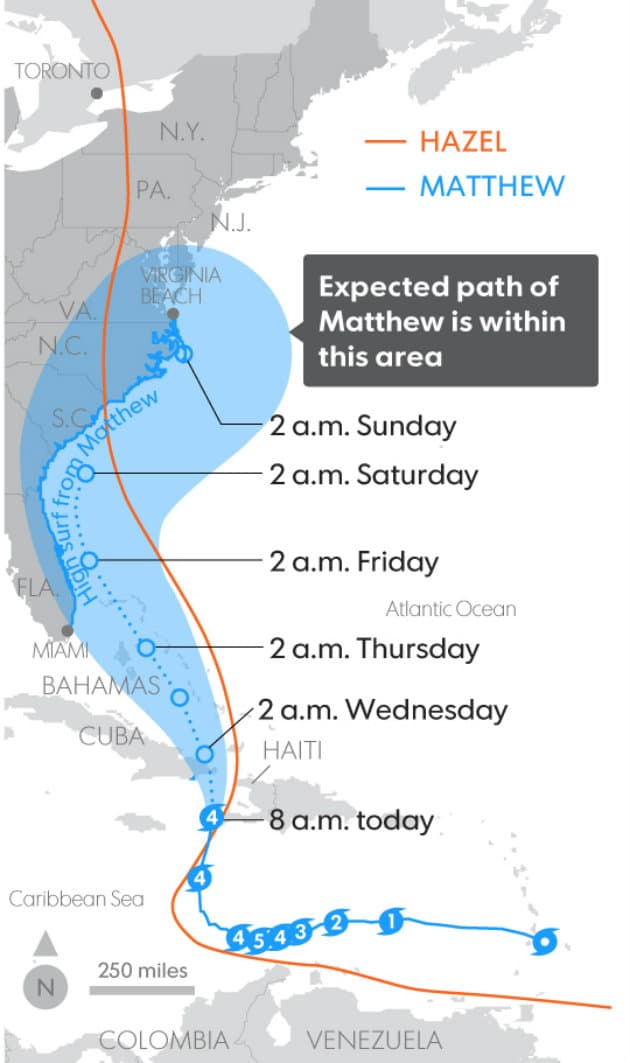Hazel atravesó las Bahamas y bordeó la Florida a unas 200 millas de distancia. Matthew se espera que pase un poco más cerca de las costas floridanas. De ahí en adelante, no se sabe exactamente cuál será su trayectoria. Habrá que esperar y ver que sucede en los próximos días. Pero si entra a territorio norteamericano por las Carolinas hasta llegar a la península de Labrador en Canadá, ya serían demasiadas coincidencias.