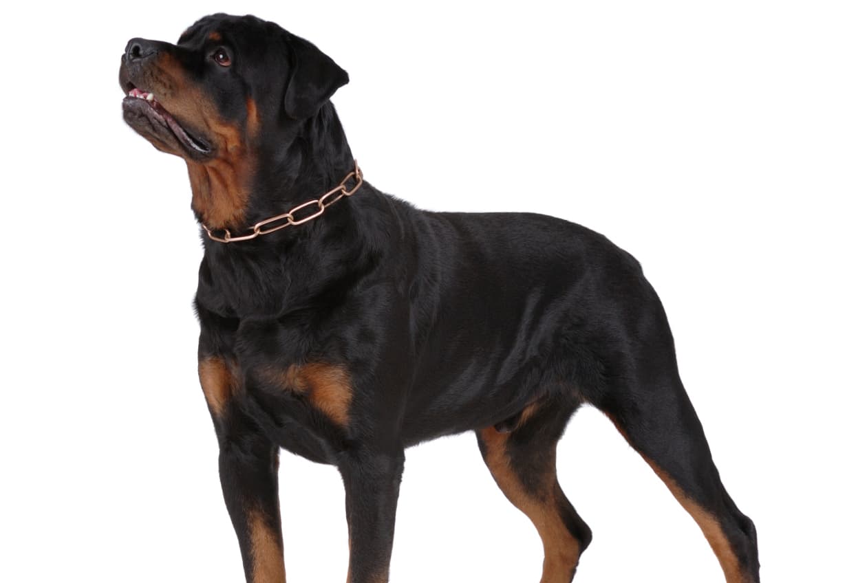 El rottweiler es una raza alemana pesa entre 45 y 59 kilos -aproximadamente lo que pesa una mujer promedio-, y tiene un fuerte instinto de proteger el territorio. Más allá de eso, bien entrenado este perro puede ser muy cariñoso.