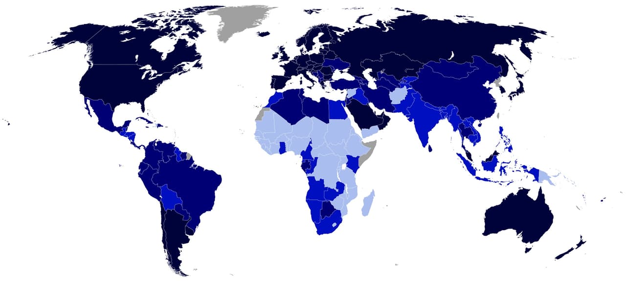 Y así es como se ve de acuerdo con el IDH de 2018. El azul más oscuro representa a la categoría de desarrollo "muy alto" y el azul más claro a las de desarrollo "bajo". (De los países en gris no se tiene información suficiente para su clasificación.)