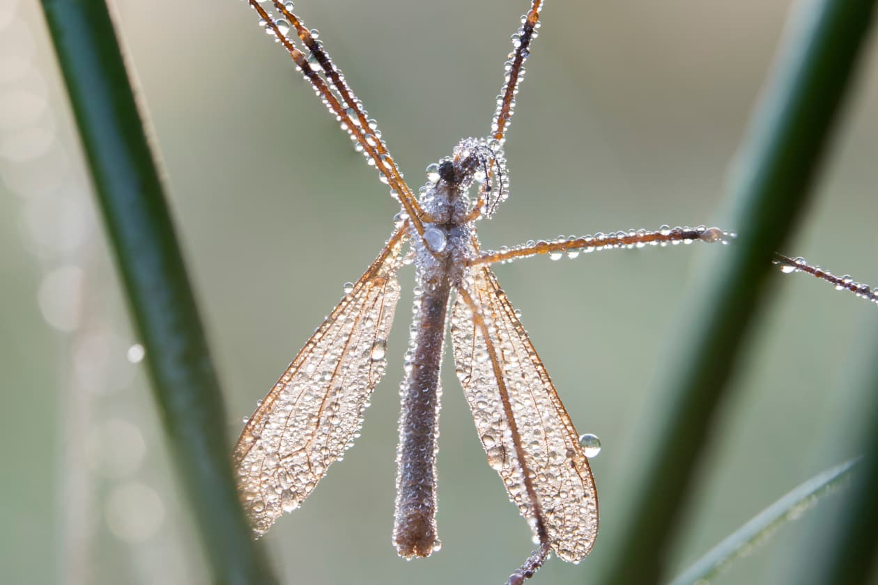 El adulto recién salido de la crisálida descansa unos momentos en la superficie del agua para secarse y endurecerse, principalmente las alas. Los mosquitos cuentan con dos ojos enormes, seis patas, dos alas y un tórax.