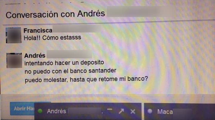 El otro método y que se da sobre todo mediante chat, es hacerse pasar por nosotros y decirle al contacto que estamos con problemas para acceder a nuestro banco, pidiendo un pequeño traspaso a otra cuenta para poder sacar el dinero.