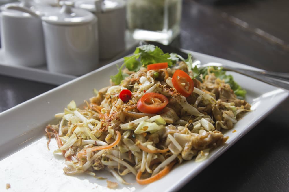 Este plato consiste en fideos (tallarines) de arroz salteados con pollo, gambas o tofu y puede ir acompañado de salsa de soja, tamarindo, brotes de soja, cacahuate, pimientos y cilantro.