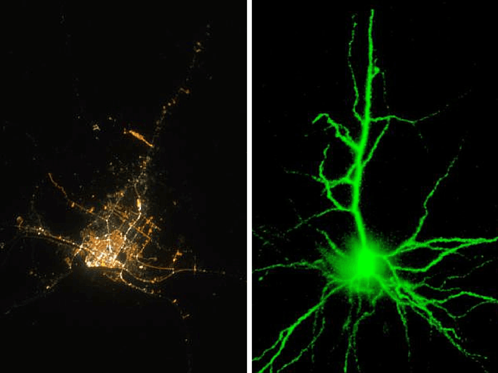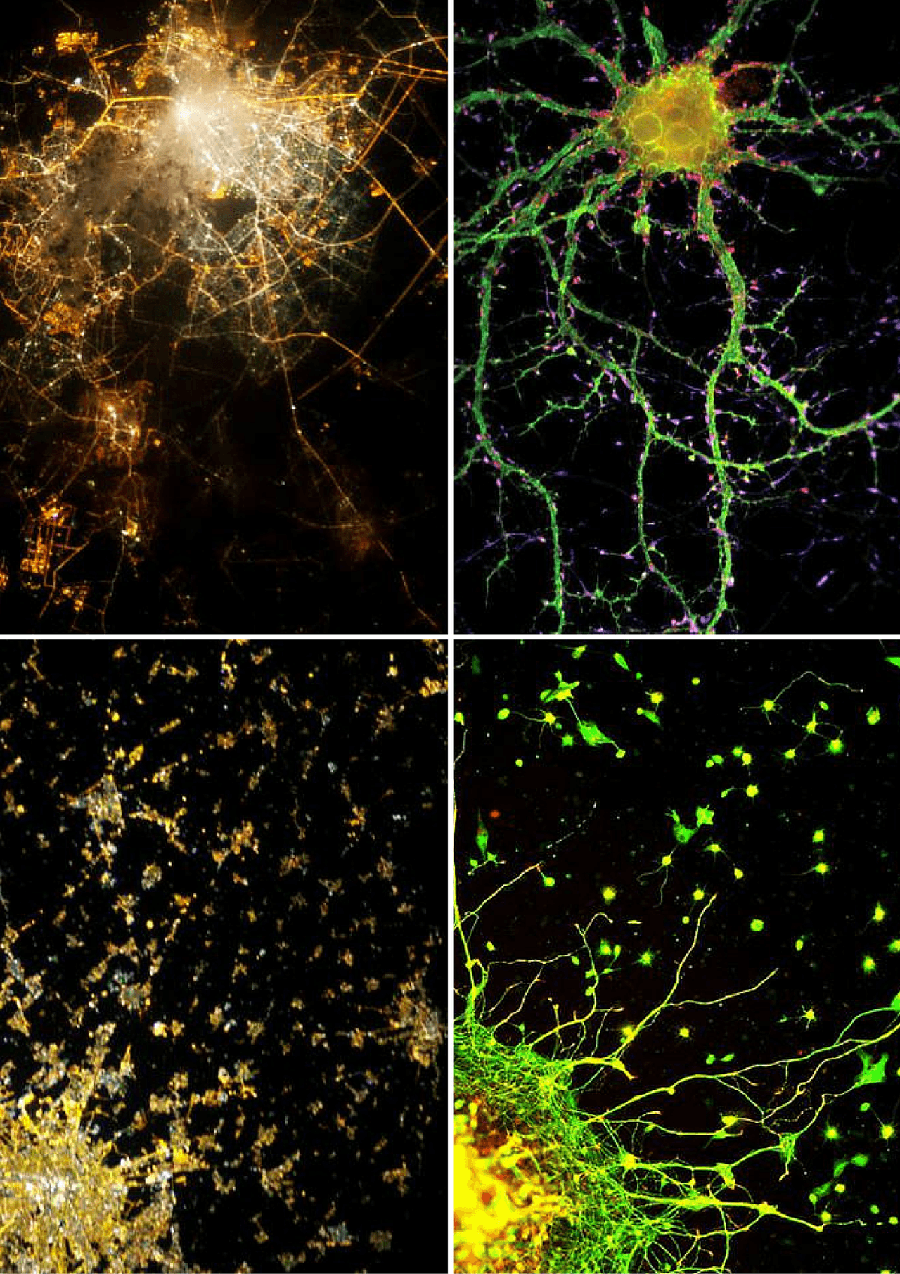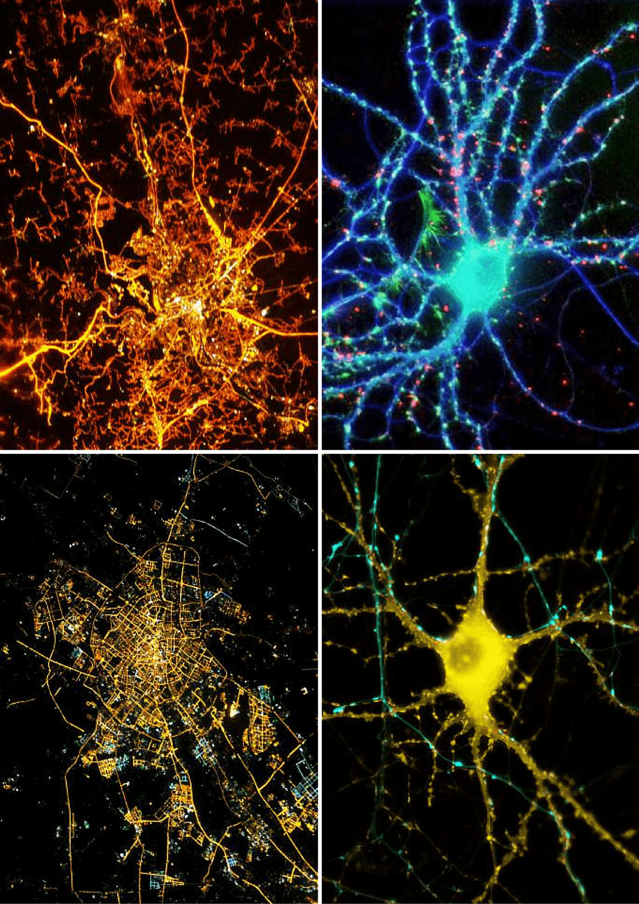 ¿Todavía cuesta ver la relación? Mira las siguientes imágenes y luego dinos si no notas el parecido. A la izquierda vemos fotografías satelitales de diferentes ciudades iluminadas por la noche, y a la izquierda imágenes microscópicas de neuronas contrastadas.