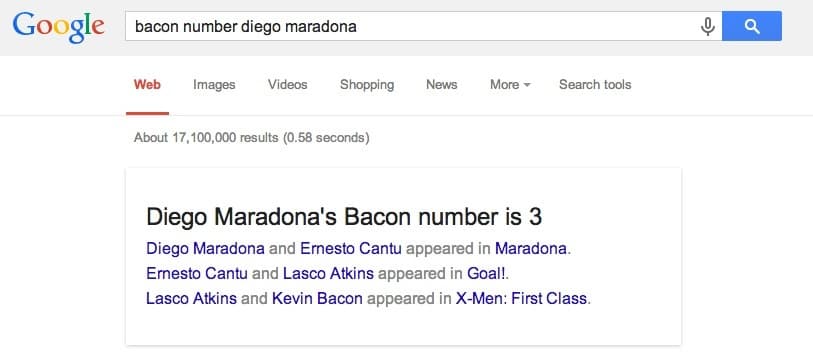 Por ejemplo, si quiero saber cuántos grados de separación hay entre Kevin Bacon y Maradona, escribo “Bacon Number Diego Maradona” en la caja de búsquedas.