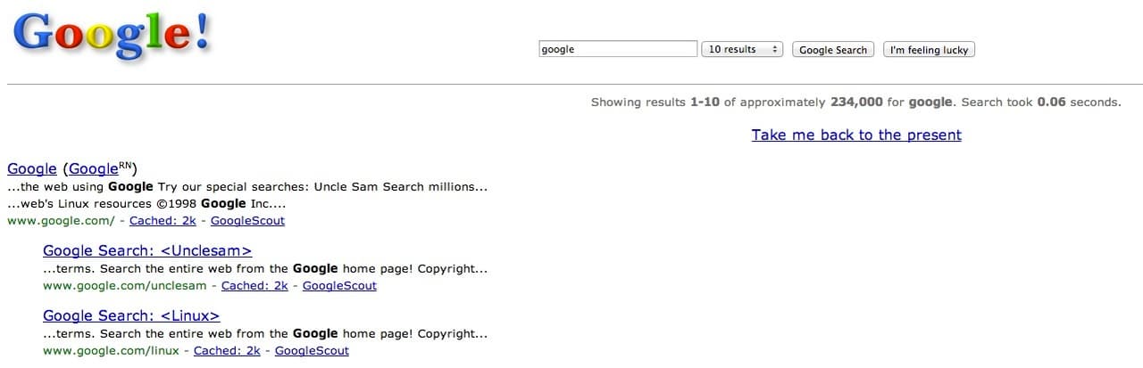 Verás la página de Google, tal y como se nos mostraba en el año 1998. Ideal para los amantes de lo retro.