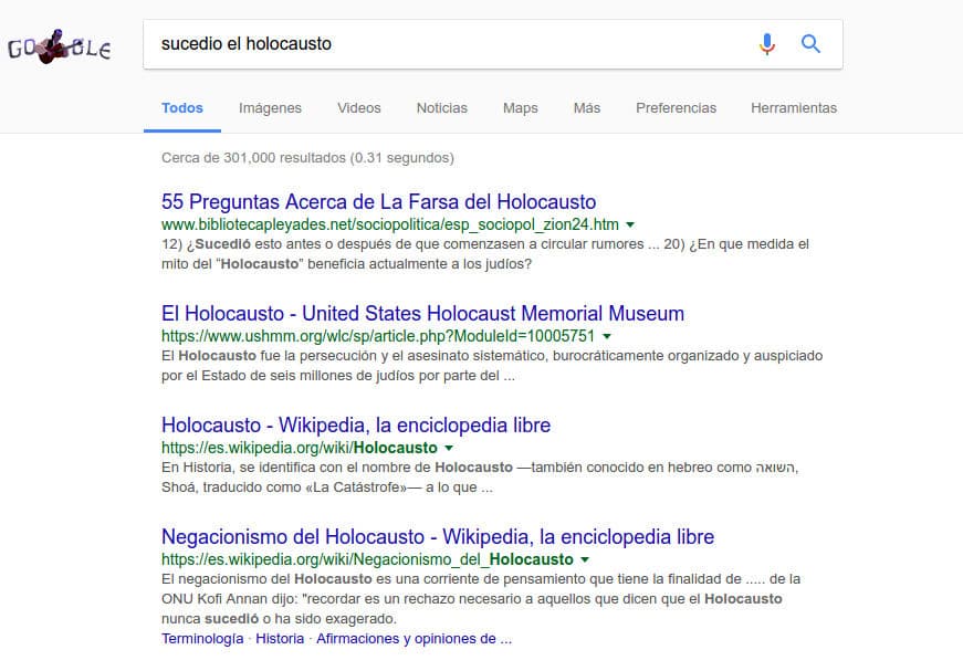 El problema surgió la semana pasada cuando algunos usuarios descubrieron que, si se realiza la búsqueda en inglés de la pregunta «¿sucedió el holocausto?», el primer resultado que brinda Google a esa pregunta es el de un artículo titulado “Top 10 razones por las que el holocausto no sucedió”.
