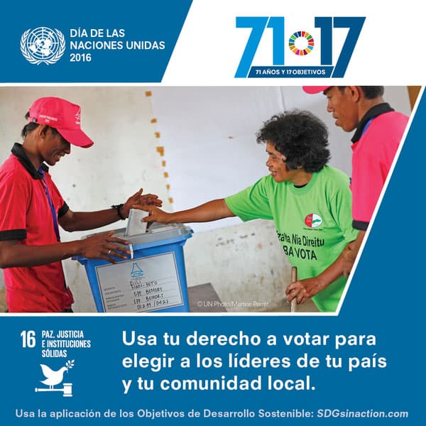 16. Paz, justicia e instituciones sólidas: Usa tu derecho a votar para elegir a los líderes de tu país y tu comunidad local.