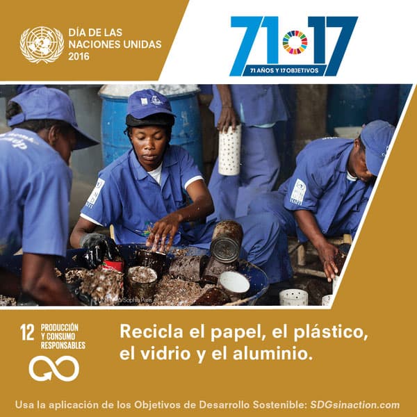 12. Producción y consumo responsables: Recicla el papel, el plástico, el vidrio y el aluminio.
