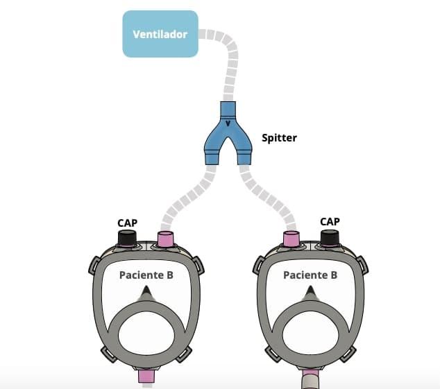 El primer diseño es una pieza llamada Splitter que divide el flujo de aire de los respiradores, de tal manera que un respirador sirve para dos pacientes que lo necesiten.