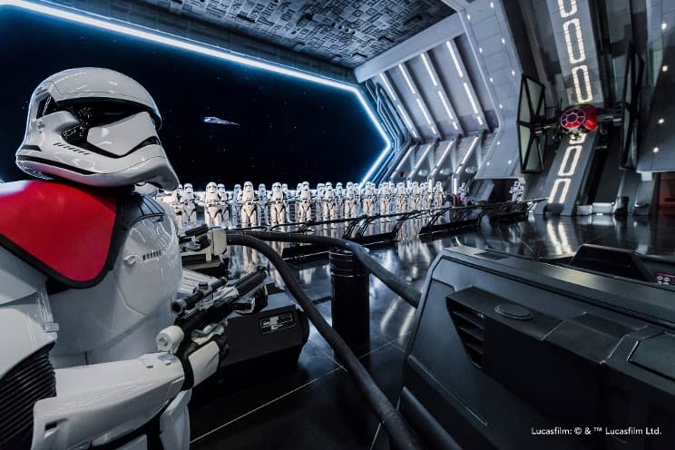 Hay dos atracciones: Millennium Falcon: Smugglers Run y Star Wars: Rise of the Resistance. En la primera, los Visitantes ingresan a la nave más famosa de la saga como Han Solo y Chewbacca en " Star Wars: The Force Awakens". Todo el entorno fue cuidadosamente diseñado para garantizar la autenticidad, desde tuberías, interruptores e incluso pegatinas en el exterior.