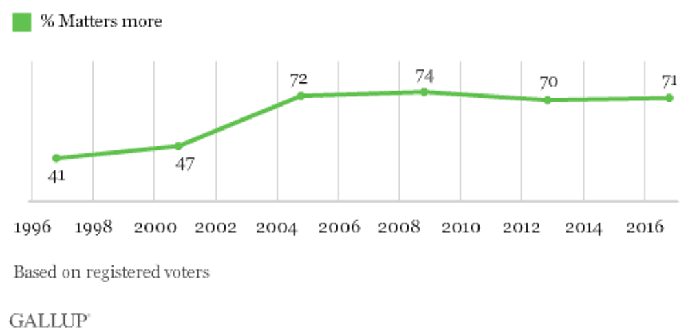 De acuerdo con las investigaciones Gallup, el aumento de la preocupación de los electores en las elecciones presidenciales a partir del año 2004, podría deberse a los problemas que dominan la agenda local en el preciso momento en que se toma la decisión del voto. Hace doce años, por ejemplo, los temas más destacados eran la Guerra de Iraq, la crisis económica y el terrorismo.