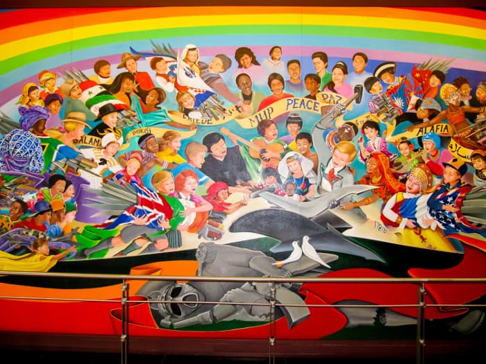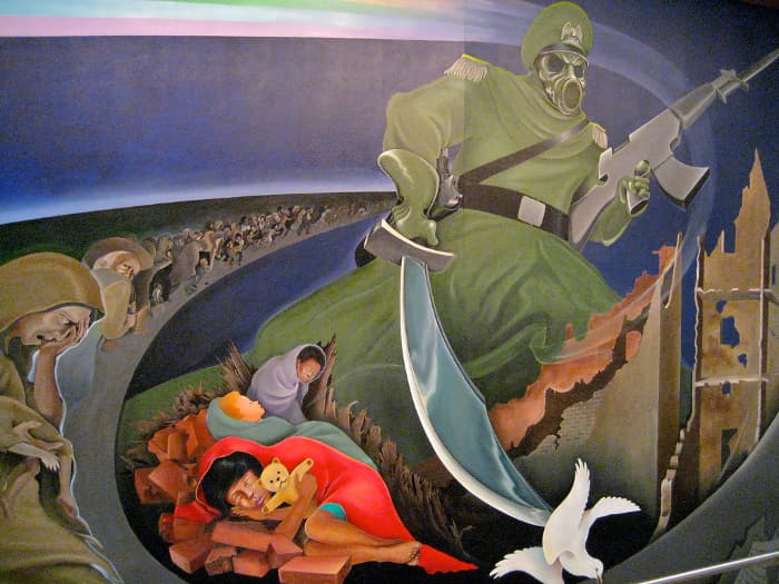 Sin embargo, lo más raro del aeropuerto son los murales. Diseñados por Leo Tanguma, uno de ellos tiene a una figura militar verde, con una máscara de gas y un arma, mientras varias personas lloran desconsoladas.