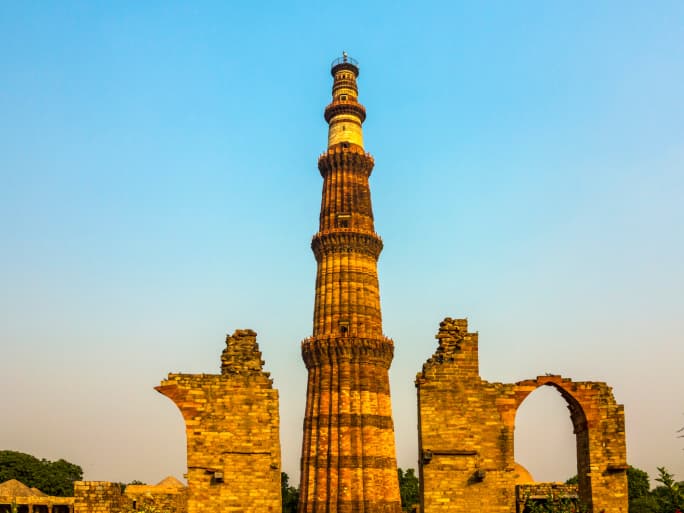 Se entra al complejo de Qutab por la imponente puerta de ladrillos de Ala-I-Darwaza, totalmente decorada con finos grabados e incrustaciones de mármol realizada bajo el mandato del primer sultán que gobernó la ciudad. A través de uno de sus arcos se ve el Minarete de Qutab Minar, que es el más alto del mundo construido con ladrillos y el monumento del Islam con más antigüedad en esas tierras.