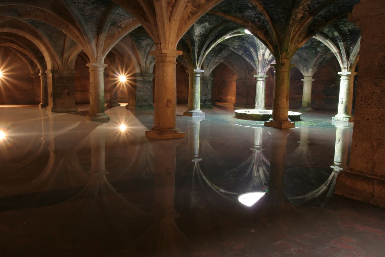 El sistema de cisternas fue construido en la primera mitad del siglo XVI, tal vez como depósito o tal vez como armería y luego se modificó su uso. La cámara subterránea es un cuadrado de treinta y cuatro metros de lado; la fina capa de agua que cubre el piso produce distintos efectos cuando en ella se reflejan las columnas espartanas que sostienen el techo, por lo que ese ámbito sombrío fue elegido para la filmación de varias películas, entre ellas Otelo de Orson Welles.