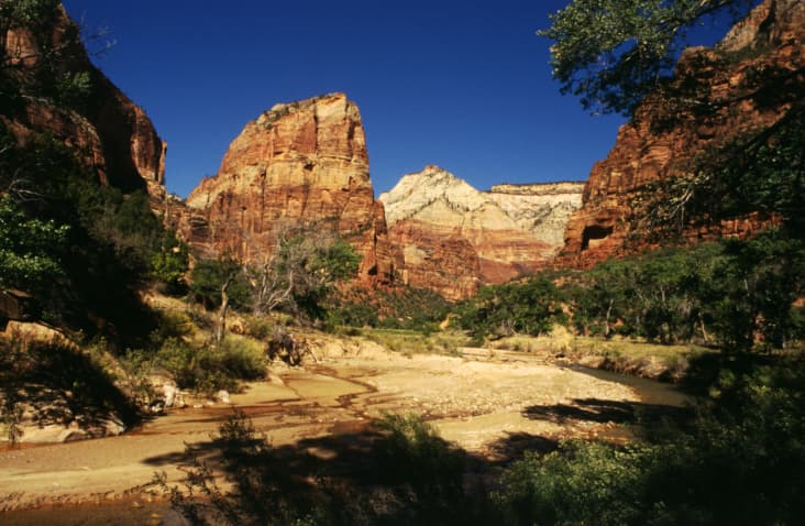 Atravesado por el Virgin River, el Parque Natural de Zion puede definirse como un caos geológico dividido en dos por el río. Numerosas elevaciones y placas verticales de piedra arenisca se levantan a más de 350 metros sucediéndose unas a otras, cortadas por el río virgen que nutre a los suelos generando vegetación abundante.