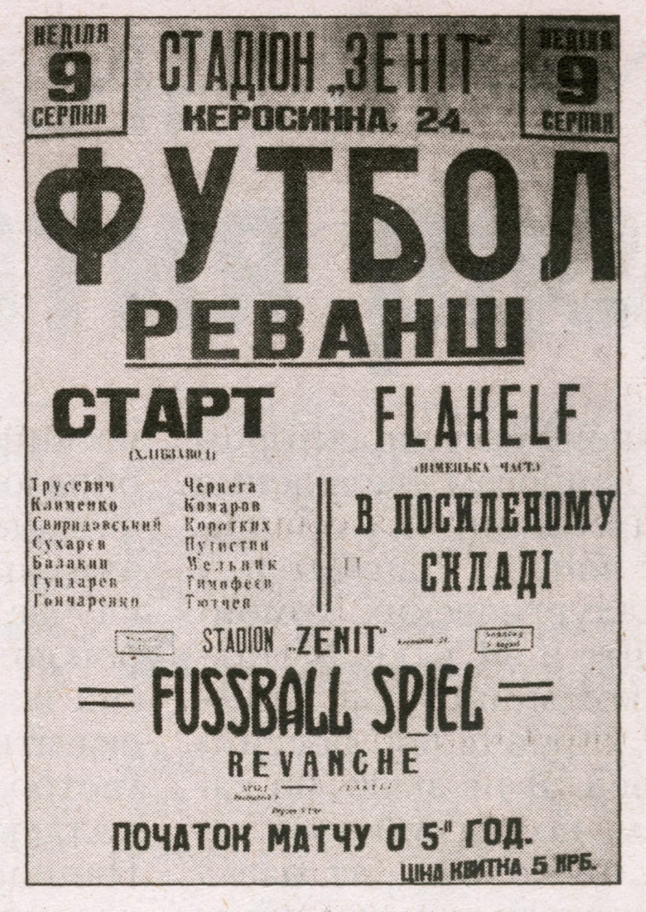 Los carteles que anunciaban el segundo partido entre Start y Flakelf estaban impresos simbólicamente en el mismo estilo y forma que los anuncios oficiales nazis, y contenían en un tamaño destacado la palabra «revancha» (que también puede significar «venganza» o «represalia»). También aseguraban que el equipo alemán se había fortalecido con nuevos jugadores.