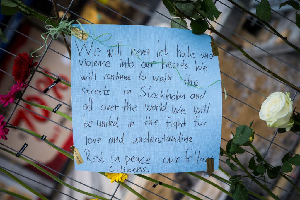Nunca dejaremos que el odio y la violencia entren a nuestros corazones. Seguiremos caminando por las calles de Estocolmo y del resto del mundo. No uniremos en la lucha por el amor y el entendimiento.