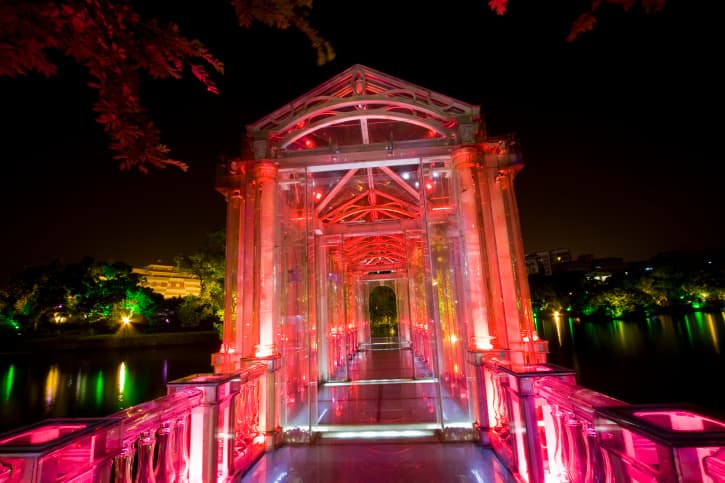 Se trata del único puente de vidrio del mundo, y tiene entrada cerrada. Originalmente, el puente se construyó para aportarle delicadeza y hermosura al lago, y no para caminar sobre él, por lo que está terminantemente prohibido cruzar a la isla mediante el puente. Algo que no impide que alquiles una lanchita, compres unos helados y recorras el lago con tu pareja fotografiando el puente en una empalagosa y cursi noche de amor.