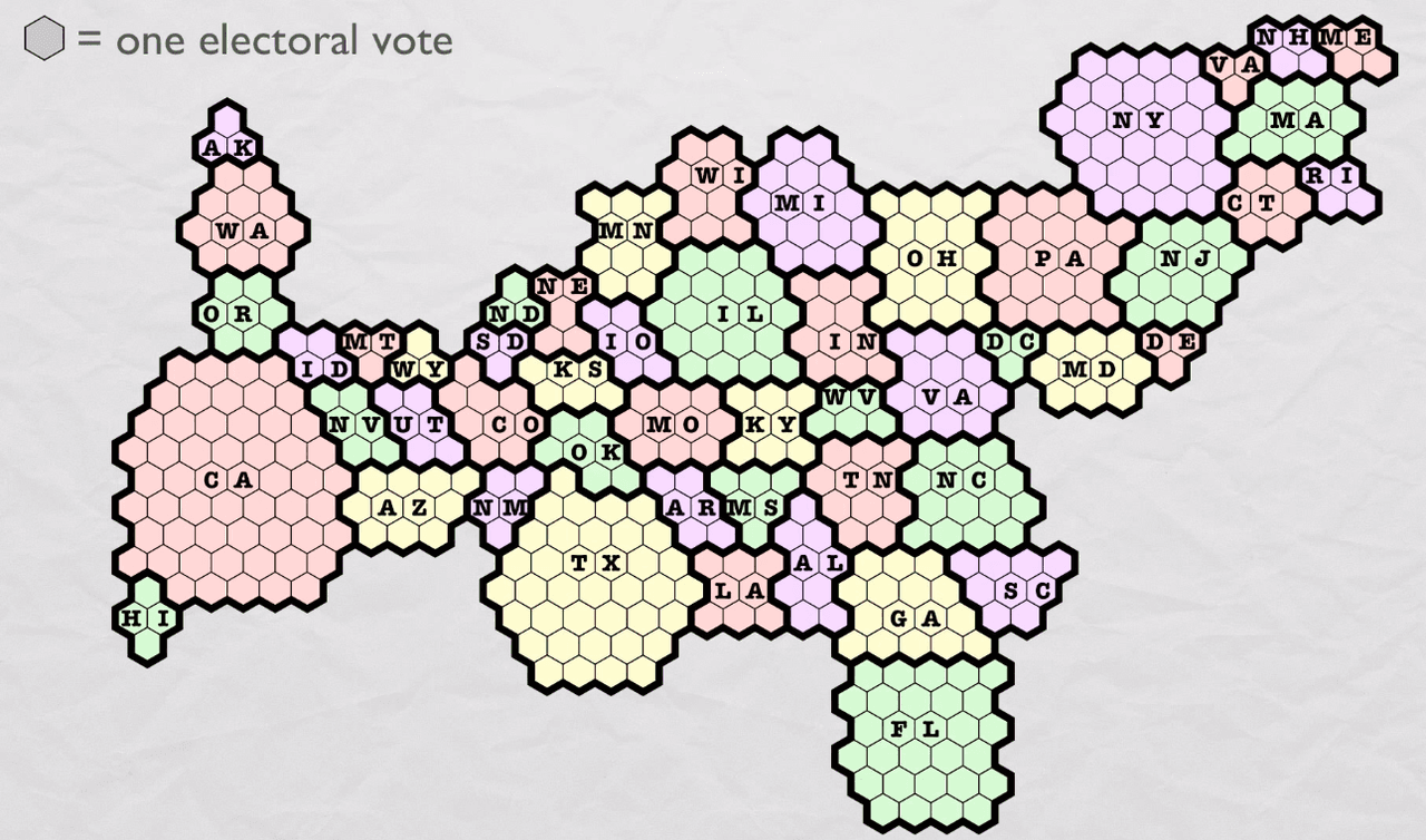 Esto implica que los políticos toman decisiones de campaña fundadas en cálculos electorales y no en posturas político ideológicas sinceras. El siguiente mapa muestra la importancia relativa de cada estado en función de la cantidad de electores que tiene.