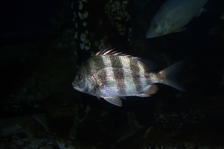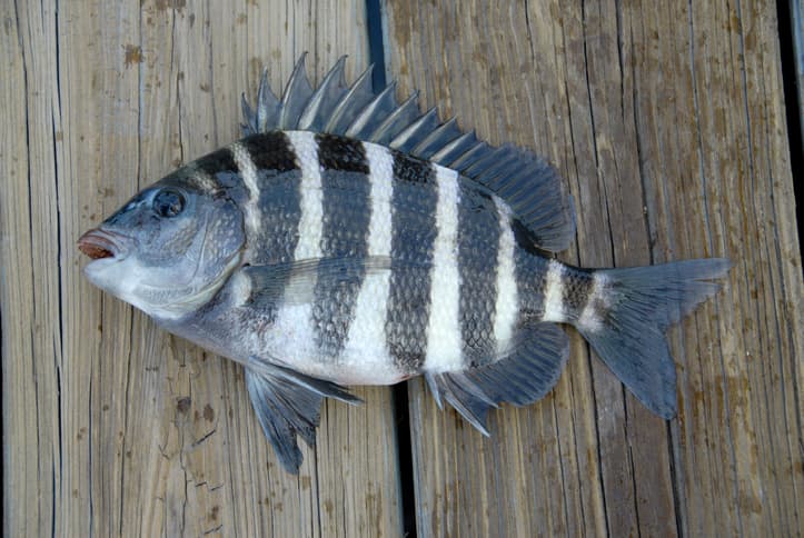 De acuerdo al Departamento de Recursos Naturales de Carolina del Sur, esta especie de pez es de color gris, con rayas negras verticales en su cuerpo. Tienen una fila de dientes incisivos al frente y otra fila de molares en la parte de atrás.