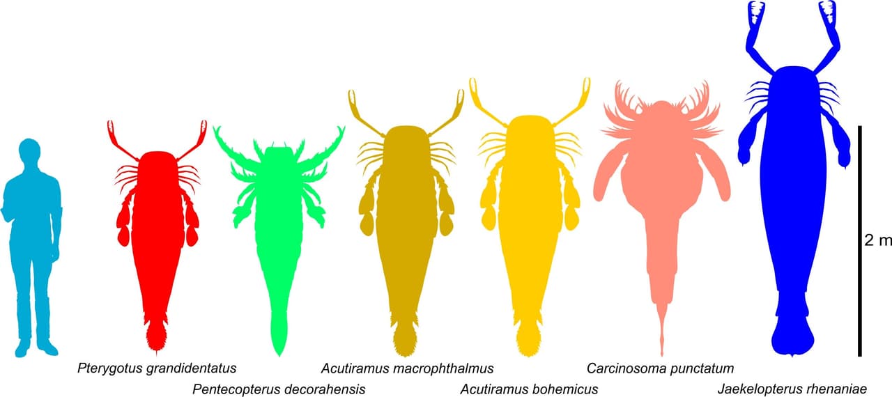 Una de las especies más grandes de Eurypterida era el Jaekelopterus rhenaniae, un animal de 2.5 metros de largo con ágiles garras para capturar presas y aplastarlos entre sus piernas, que tenían estructuras en forma de dientes llamadas espinas gnathobasic.