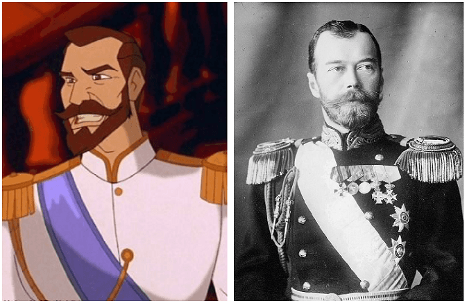 El padre de Anastasia, el zar Nicolás II, aparece en la película como un padre amoroso, sin embargo en la vida real era apodado " Nicolás el Sanguinario" debido a que su reinado inició con la tragedia de Khodynka.