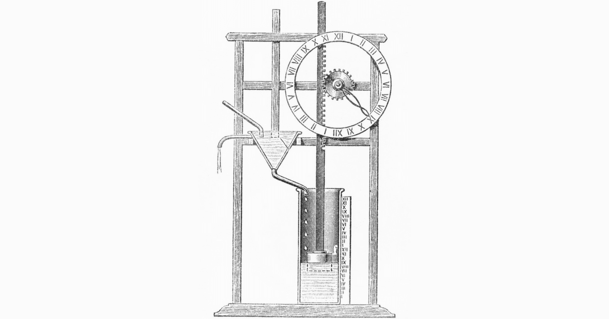 Los relojes de agua o clepsidra eran utilizados por civilizaciones hace miles de años. Se trata de un mecanismo para medir el tiempo utilizando un flujo regulado de agua hacia un recipiente graduado. Estos relojes eran utilizados en Egipto y servían principalmente en la noche, ya que sin el sol los relojes de sol no eran de mucha utilidad.
