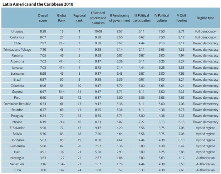 Índice de Democracia 2018 Latinoamérica y Caribe